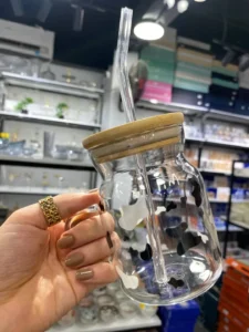 2. 🧊 زجاج مضلع وشفاف: المج خامته زجاجية شفافة ونقية، ومضلع من الخارج، وده بيخلي شكله أنيق وبيوضّح جمال مشروبك.