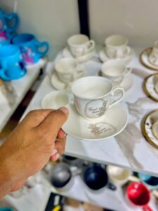 طقم قهوة بورسلين أبيض عليه رسمة وردة رقيقة، يدي إحساس بالرُقي والنعومة في كل رشفة.