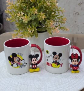 🎁 طقم ميكي وميني كلاسيكي: الطقم فيه مج لميكي ماوس 🐭 ومج لميني ماوس 🎀، برسومات كرتونية مبهجة جداً والبطانة الداخلية لونها أحمر ناري. ❤️