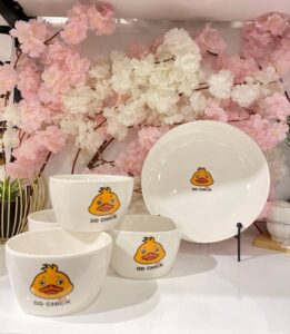 3️⃣ سهل التنضيف وشكله أنيق – الأبيض الكلاسيك مع رسمة البطّة يخلّوا الطقم مميز في أي مناسبة.