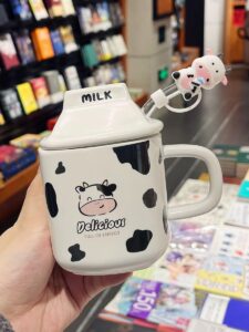 🐮 تصميم شكل كرتونة الحليب: المج شكله كأنها علبة حليب مصغّرة (Milk Carton)، مع الألوان الأبيض والأسود اللي بتدي شكل البقرة. تصميم مودرن جداً! 🖤🤍