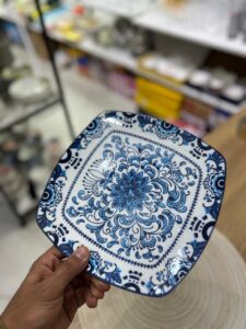 تصميمه المربع بزخارف زرقا مستوحاة من النقوش الشرقية، يدي طابع راقي لأي سفرة.